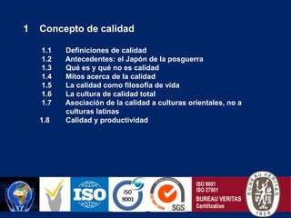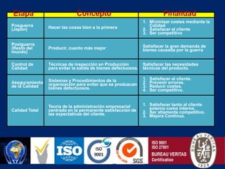 Este documento trata sobre la gestión de la calidad total y la evolución del concepto de calidad a través del tiempo. Explica que inicialmente la calidad se enfocaba en el control y la inspección, pero luego evolucionó hacia el aseguramiento de la calidad mediante la prevención de defectos. Más adelante, surgió el enfoque de calidad total, el cual busca la satisfacción del cliente a través de la mejora continua e involucrando a todo el personal de la empresa. Finalmente, el documento describe la importancia de alinear la