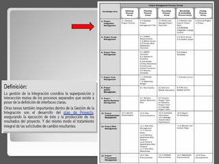 Este documento describe los procesos de integración de proyectos, incluyendo desarrollar el acta de constitución, desarrollar el plan de gestión, dirigir la ejecución, supervisar el control, realizar el control de cambios y cerrar el proyecto. Explica cada proceso, sus entradas, herramientas, técnicas y resultados. La integración es fundamental para coordinar las diferentes áreas y procesos de un proyecto para lograr sus objetivos.