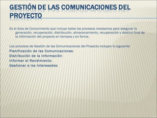 El documento describe los procesos relacionados con la gestión de la información de un proyecto, incluyendo la planificación de comunicaciones, distribución de información, informar el rendimiento y gestionar a los interesados. Estos procesos se encargan de generar, recopilar, distribuir, almacenar y dar destino final a la información del proyecto de manera oportuna.