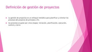 El documento describe los conceptos clave de la gestión de proyectos de software. Explica que la gestión de proyectos es un enfoque metódico para planificar y guiar un proyecto desde el inicio hasta el cierre a través de cinco etapas clave. También describe las cuatro P fundamentales de la gestión de proyectos: Personal, Producto, Proceso y Proyecto. Finalmente, resume varias metodologías populares para el desarrollo de software como el modelo en cascada, el modelo iterativo y modelos ágiles como Scrum, Kanban y XP