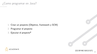 El documento ofrece una guía sobre la gestión de proyectos utilizando Maven, incluyendo la creación, programación y ejecución de proyectos en Java. Se describen conceptos clave como el Project Object Model, arquetipos, fases de construcción, y ejemplos de uso de plugins. Además, se presentan ejercicios prácticos para aplicar los conocimientos adquiridos.