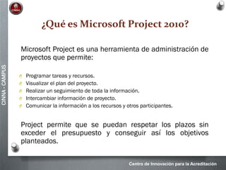 Microsoft Project es una herramienta de gestión de proyectos que permite programar tareas y recursos, visualizar el plan del proyecto, realizar un seguimiento de la información, y comunicar la información a los participantes del proyecto. Project permite respetar los plazos y el presupuesto para alcanzar los objetivos planteados mediante la planificación de tareas, recursos, costos, y el seguimiento del progreso del proyecto.