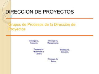 Este documento presenta una introducción a la gestión de proyectos. Explica que los procesos de dirección de proyectos se dividen en cinco grupos: iniciación, planificación, ejecución, supervisión y control, y cierre. Describe cada grupo de procesos y sus entradas y salidas. Además, detalla los ocho componentes clave de la planificación de un proyecto: alcance, cronograma, costos, calidad, personal, comunicaciones, riesgos y adquisiciones.