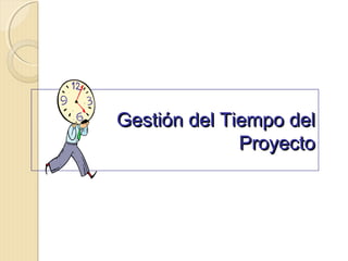 El documento habla sobre la gestión del tiempo en proyectos. Explica que este proceso incluye definir actividades, establecer su secuencia lógica, estimar recursos y duración de cada actividad, desarrollar un cronograma y controlarlo. Luego detalla cada uno de estos pasos clave para administrar adecuadamente el tiempo del proyecto.