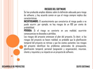 Este documento trata sobre la gestión de riesgos, calidad y cambio en el desarrollo de proyectos de software. Identifica varios riesgos conocidos en el desarrollo de proyectos de software como el tamaño del producto, el impacto en el negocio y las características del cliente. También discute la identificación de riesgos, los cuatro pilares de la gestión de calidad del software (procesos, técnicas, organización e infraestructura) y conceptos como el aseguramiento y control de calidad del software.