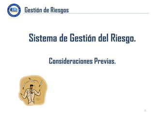Este documento describe los conceptos y procesos clave de un sistema de gestión de riesgos. Explica que un sistema de gestión de riesgos es un instrumento para organizar procedimientos que analizan y controlan los riesgos durante un proceso. Luego describe las cuatro fases del sistema: planificación, ejecución, control y ajuste, con énfasis en la identificación de riesgos, análisis de riesgos, y desarrollo de respuestas durante la planificación. Finalmente, concluye que un sistema de gestión de riesgos