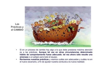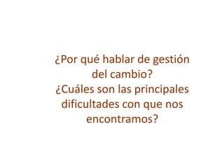 Este documento presenta información sobre el modelo de gestión del cambio. Explica conceptos como cambio, resistencia al cambio debido a miedos y diferentes velocidades de cambio. También describe nuevas tendencias como gestión del conocimiento, liderazgo participativo, enfoque al cliente y gestión del cambio. Finalmente, analiza factores como cultura organizacional, prácticas, creencias y su influencia en los procesos de cambio.