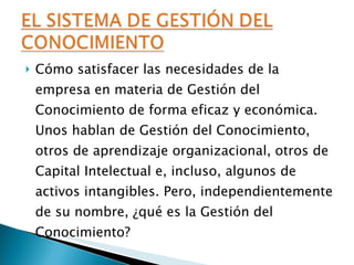 La Gestión del Conocimiento se refiere a la gestión de los activos intangibles que generan valor para una organización, especialmente los procesos relacionados con la captación, estructuración y transmisión de conocimiento. Su principal herramienta es el aprendizaje organizacional, mediante el cual el conocimiento se convierte en capital intelectual. La Gestión del Conocimiento pretende identificar, recoger y organizar el conocimiento existente, facilitar la creación de nuevo conocimiento e iniciar la innovación para mejorar el rendimiento empresarial.