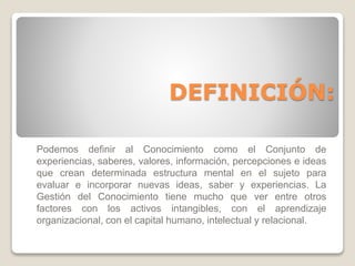 La gestión del conocimiento se define como el conjunto de experiencias, saberes, valores, información y percepciones que crean una estructura mental para evaluar e incorporar nuevas ideas. Su importancia radica en que ayuda a las organizaciones a obtener y transformar información en conocimiento útil para ponerlo en práctica más rápido que la competencia y así atender mejor a los clientes y tener éxito.