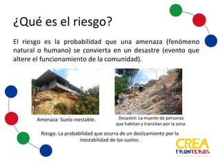 La gestión del riesgo se define como el proceso de identificar, analizar y cuantificar las probabilidades de pérdidas y efectos secundarios que se generan ante un desastre. Incluye identificar el riesgo, analizar las causas y acciones para prevenirlo, y realizar planes de acción y cuantificar los efectos secundarios del riesgo. El riesgo depende de la amenaza y la vulnerabilidad, y la gestión del riesgo busca reducirlos a niveles aceptables para prevenir daños a la comunidad.
