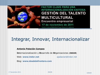 El documento habla sobre la internacionalización de las organizaciones y la necesidad de que Europa acompañe el desarrollo de los países emergentes. También destaca cómo las empresas valencianas pueden mejorar su estructura incorporando diversidad cultural a través de la contratación de inmigrantes con conocimientos de idiomas y culturas extranjeras. Finalmente, describe una experiencia piloto donde empresas valencianas contrataron a inmigrantes para abordar mercados internacionales después de capacitarlos como técnicos de comercio exterior.