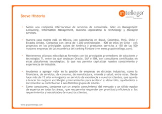 El documento resume los aspectos clave de la gestión documental, incluyendo su definición, objetivos, soluciones que aporta, cómo opera un gestor documental, herramientas disponibles en el mercado como Alfresco, y los servicios de consultoría relacionados que ofrece Intellego.