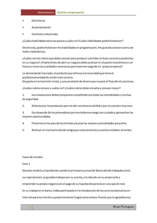 El documento presenta una serie de preguntas sobre la toma de decisiones y la preparación para iniciar un nuevo negocio. Se cuestiona si la persona está dispuesta a asumir los riesgos y responsabilidades de un negocio propio, si conoce sus habilidades, los requisitos del mercado y si está comprometido con el trabajo duro necesario para tener éxito. Adicionalmente, se presentan varios casos sobre personas que deciden emprender sus propios negocios y la planificación que realizan.