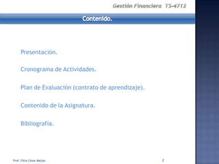 El documento abarca la presentación de la asignatura de gestión financiera, incluyendo cronograma, evaluación y temas a tratar. Se analizan conceptos como tesorería, capital de trabajo, financiación a corto y largo plazo, así como la administración del capital y control del dinero. Se destaca la importancia de la gestión financiera eficiente para maximizar recursos y minimizar riesgos.