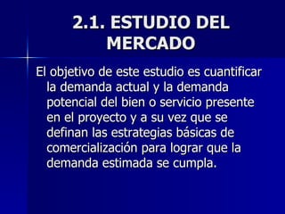 Este documento resume los conceptos clave para realizar un estudio de mercado para un proyecto. Explica cómo identificar el bien o servicio, analizar la demanda actual y potencial, segmentar el mercado, estudiar la oferta competitiva, y diseñar una estrategia de comercialización y fijación de precios. El objetivo final es cuantificar la demanda para lograr los objetivos de ventas planteados para el proyecto.