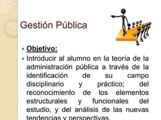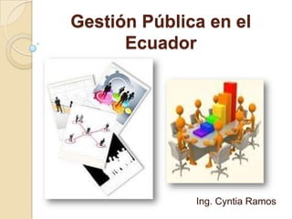 El documento presenta una introducción a la gestión pública en Ecuador. Explica que la gestión pública tiene como objetivo la identificación de su campo disciplinario y práctico, así como el reconocimiento de sus elementos estructurales y funcionales. También analiza la evolución histórica de la administración pública desde las sociedades primitivas hasta la actualidad, destacando los cambios en la organización social y la división del trabajo a lo largo del tiempo. Por último, resalta la importancia de mejorar la eficiencia y eficacia del sector público