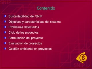 El documento habla sobre la gestión de proyectos de inversión pública. Explica que el objetivo del Sistema Nacional de Inversión Pública (SNIP) es mejorar la eficiencia de los recursos públicos y maximizar el impacto de los proyectos en el desarrollo. Luego, describe las características del ciclo de proyectos como la identificación, formulación, evaluación y gestión ambiental. Finalmente, detalla cada una de estas etapas del ciclo de proyectos.