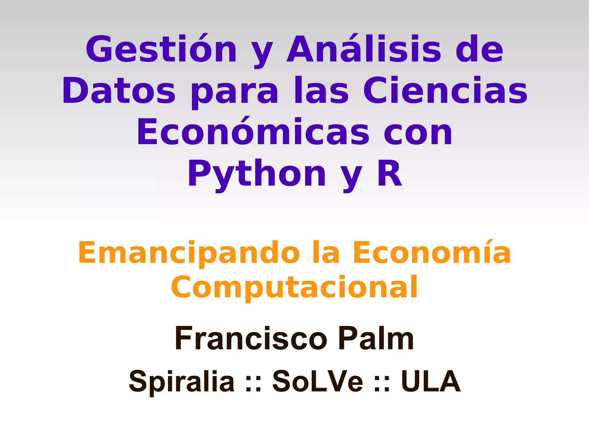 El documento trata sobre la gestión y análisis de datos en las ciencias económicas utilizando Python y R, enfatizando la importancia de la economía computacional. Se comparan ambos lenguajes, señalando sus similitudes y diferencias, así como sus aplicaciones en estadística, econometría y finanzas. Además, se mencionan diversas bibliotecas y herramientas disponibles para cada lenguaje que facilitan el análisis de datos.