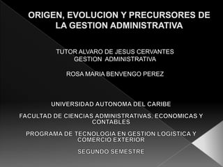 El documento describe la evolución de la administración a través de la historia, desde las civilizaciones antiguas hasta la era moderna. Explica que la administración ha existido desde tiempos remotos para coordinar actividades y recursos, y destaca algunos de los primeros pensadores administrativos como Jetro y los sistemas administrativos en Mesopotamia, Grecia y Roma. Luego resume brevemente los desarrollos administrativos durante la Edad Antigua, la Edad Media, la Edad Moderna y la Edad Contemporánea, culminando con las
