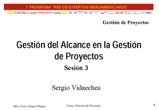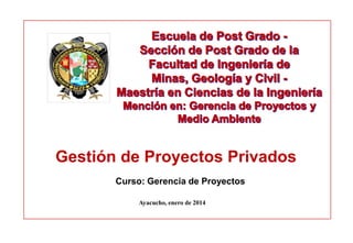El documento presenta un curso de programación y control de proyectos de ingeniería impartido por Sergio Villegas en Ayacucho en enero de 2014 y Lima en diciembre de 2011, el cual cubre temas relacionados a la gerencia de proyectos privados.