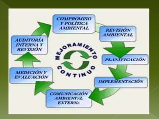 El documento describe los principales elementos de los sistemas de gestión ambiental basados en el modelo PHVA (Planificar, Hacer, Verificar y Actuar) y las normas ISO 14001 y EMAS. Resume que la ISO 14001 establece las especificaciones para implementar un sistema de gestión ambiental efectivo que logre el equilibrio entre la rentabilidad y la reducción del impacto ambiental, mientras que la EMAS es más estricta al requerir una declaración ambiental pública y una validación externa.