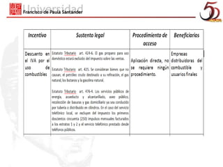 Este documento describe los instrumentos económicos y fiscales utilizados en la política ambiental colombiana, incluyendo subsidios. Explica que los subsidios buscan incentivar acciones favorables al medio ambiente mediante pagos o descuentos de impuestos. Detalla dos tipos de subsidios: subsidios para equipos de abatimiento de contaminación y subsidios por unidad de reducción de contaminación. También cubre otras herramientas como deducciones de IVA y renta para proyectos ambientales, así como el uso de regalías nacionales para la inversión ambiental.