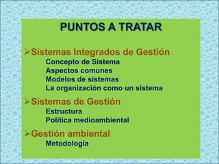 Este documento presenta información sobre sistemas integrados de gestión y gestión ambiental. Se define un sistema como un conjunto de elementos relacionados para alcanzar objetivos. Los sistemas de gestión incluyen estructura, política medioambiental y procesos. La organización también se considera como un sistema. Se describen características comunes de los sistemas de gestión como establecer una política y objetivos, y revisar el desempeño.