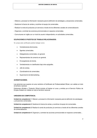 Este documento presenta un curso de Gestión Comercial de Ventas. El curso tiene como objetivo capacitar a los estudiantes para organizar, realizar y controlar las operaciones comerciales y de ventas. El curso dura 610 horas y cubre temas como la organización comercial, gestión de fuerzas de ventas, técnicas de venta, promociones, y comunicación comercial en inglés. Los estudiantes que completen el curso recibirán un Certificado de Profesionalidad Oficial en Gestión Comercial de Ventas.