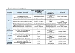 El documento describe el plan de comunicaciones para un proyecto de modelación numérica para estudiar inundaciones en el Río Portoviejo en Ecuador. El plan detalla la información requerida por las partes interesadas como el tesista, ayudantes administrativo, de hidrología e informático, consultor de modelación, director y comisión de revisión. También especifica los documentos a comunicar, el responsable de elaborarlos y la frecuencia con que se realizarán las comunicaciones como reuniones e informes durante el proyecto.