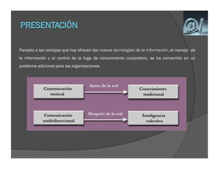 Este documento describe los principios fundamentales de la gestión del conocimiento. Explica que la gestión del conocimiento implica la captura, clasificación, acceso, control de calidad y medición del conocimiento interno y externo de una organización. También detalla algunas herramientas y procesos clave para implementar un sistema efectivo de gestión del conocimiento.