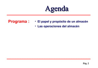 El documento habla sobre la gestión de almacenes. Define un almacén como un espacio planificado para el almacenaje y manipulación eficiente de bienes y materiales. Explica que el objetivo básico de un almacén es proporcionar el nivel de servicio deseado a un costo aceptable. Detalla las principales actividades y operaciones de un almacén como la recepción, almacenaje, preparación de pedidos y expedición.