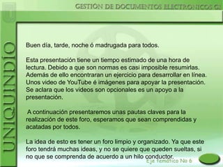 El documento introduce conceptos clave sobre documentos electrónicos y presenta una reseña de la legislación y normatividad colombiana relevante como la Ley 527 de 1999 sobre firma electrónica. Adicionalmente, explica normas técnicas como la