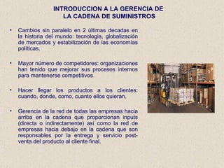 El documento describe los conceptos clave de la gestión de la cadena de suministro. Explica que la gestión de la cadena de suministro integra todas las actividades asociadas con el flujo y transformación de productos desde los proveedores hasta el cliente final, con el objetivo de reducir costos y satisfacer las necesidades del cliente. También describe las funciones internas y los miembros externos de la cadena de suministro y el uso de tecnologías de información para mejorar la integración e información a lo largo de la cadena.