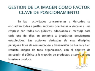 El documento discute la importancia de la imagen y el posicionamiento para las empresas. Explica que la imagen se refiere a la percepción que tienen los consumidores de una empresa, sus productos y marcas. El posicionamiento es cómo los consumidores definen un producto en relación con sus atributos y competidores. Se proveen ejemplos de cómo Pepsi y Ford han logrado una buena imagen y posicionamiento en el mercado a través de la innovación y la publicidad.