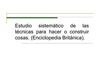 El documento presenta información sobre gestión tecnológica. Define la tecnología como el estudio sistemático de técnicas para construir cosas y como los medios creados por humanos para facilitar su entorno. Explica el ciclo de vida de la tecnología que incluye las fases de emergencia, crecimiento, madurez y saturación. También describe conceptos clave como los 6M de tecnología y las funciones tecnológicas como I+D, prospectiva tecnológica y vigilancia tecnológica