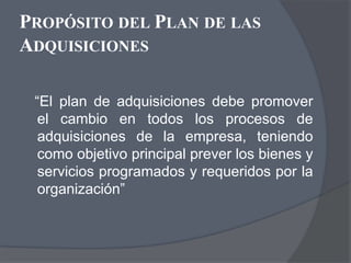 El documento describe el plan actual de adquisiciones de una empresa que carece de organización y procesos definidos. Propone la creación de un área de adquisiciones, el desarrollo de un plan de compras detallado que incluya la programación, documentos tipo y criterios de selección. También recomienda mejorar la coordinación entre áreas para lograr una gestión eficaz de las compras que permita obtener resultados positivos.