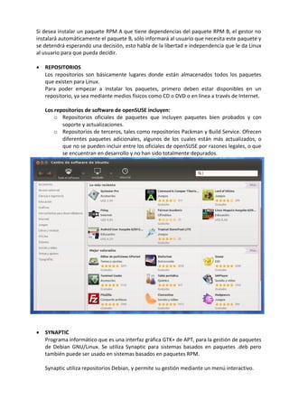El documento describe los sistemas de gestión de paquetes en Linux, que automatizan la instalación y actualización de software a través de paquetes. Los paquetes contienen archivos de software, metadatos y dependencias. Los gestores de paquetes usan repositorios para almacenar paquetes disponibles y herramientas como apt-get y synaptic para instalar y administrar paquetes. El documento también explica los permisos de archivos y directorios en Linux.