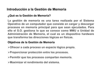 La gestión de memoria es una función del sistema operativo que coordina el uso de la memoria principal para cargar y ejecutar procesos, asegurando la protección y eficiencia en el uso del espacio. Existen diversas políticas para la asignación y gestión de memoria, incluyendo particiones estáticas y dinámicas, así como técnicas de paginación y segmentación que abordan desafíos como la fragmentación. La memoria virtual permite simular un espacio de memoria mayor al físico, facilitando la ejecución eficiente de programas sin requerir que todo su contenido esté en memoria principal de inmediato.