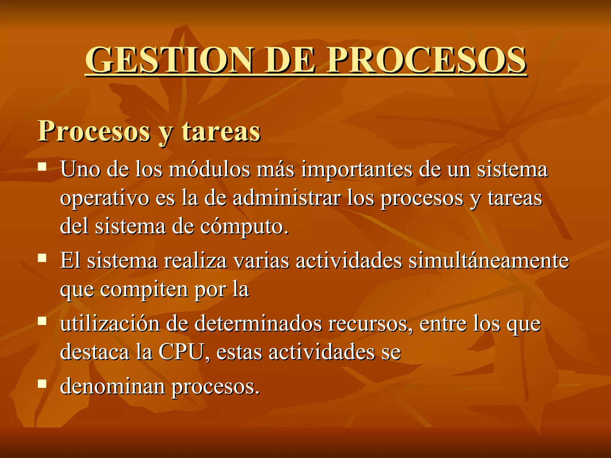 Este documento describe los conceptos de procesos y estados de procesos en sistemas operativos. Explica que un proceso es una entidad activa que compite por recursos como la CPU, y que el sistema operativo administra los procesos y su ejecución. También describe los cinco estados típicos de un proceso: nuevo, listo, en ejecución, bloqueado y terminado.