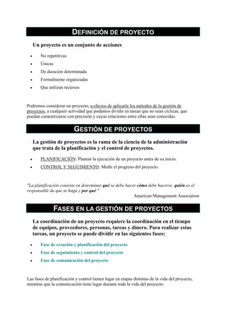 Un proyecto se define como un conjunto de acciones no repetitivas, únicas, de duración determinada y formalmente organizadas que utilizan recursos. La gestión de proyectos incluye la planificación, el control y el seguimiento del proyecto a lo largo de su ciclo de vida. Un proyecto generalmente se divide en fases de creación y planificación, seguimiento y control, y comunicación.