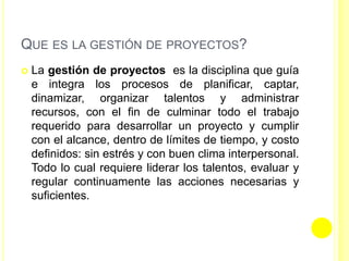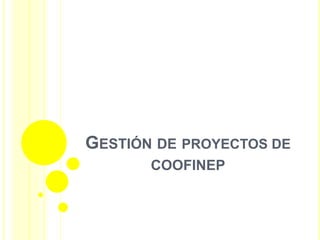 La gestión de proyectos implica planificar, organizar recursos y talentos, y administrar el trabajo requerido para desarrollar e implementar un proyecto a tiempo y dentro del presupuesto. COOFINEP ha fortalecido su gestión de proyectos mediante alianzas que optimizan su cartera y amplían su alcance nacional. Se propone que incluyan créditos accesibles para las clases media y baja, así como un programa para incluir ideas de los empleados dado su conocimiento de los clientes.