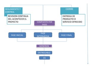 El documento describe los conceptos básicos de la gerencia de proyectos, incluyendo las 5 fases del ciclo de vida de un proyecto (iniciación, planificación, ejecución, seguimiento y control, y cierre), los entregables generados en cada fase, y los roles y responsabilidades del director del proyecto, el equipo de trabajo, el patrocinador y el usuario empresarial.