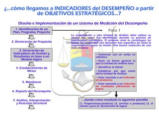 El documento presenta un taller sobre el diseño e implementación de un sistema de medición del desempeño a partir de objetivos estratégicos. Explica un proceso de 7 pasos que incluye la identificación de planes y objetivos, la generación de indicadores, el establecimiento de metas, el monitoreo, el reporte del desempeño y el análisis. Proporciona ejemplos y plantillas para escribir objetivos cuantificables y desarrollar indicadores asociados a áreas de servicio específicas.