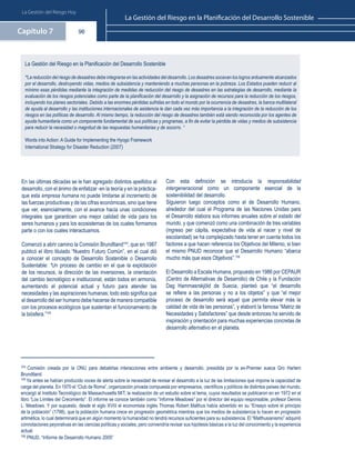 El documento habla sobre la gestión del riesgo en la planificación del desarrollo sostenible. Se divide en el capítulo 7 y contiene información sobre cómo integrar la gestión del riesgo en los planes de desarrollo para crear comunidades más seguras y sostenibles.
