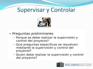 Este documento describe los procesos de supervisión y control de gestión, incluyendo la definición de supervisión y control, las razones para realizarlos, y las entradas, herramientas y salidas de estos procesos. También cubre el control integrado de cambios y el sistema de gestión de la configuración, así como sus actividades y entradas/herramientas/salidas respectivas.