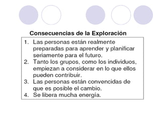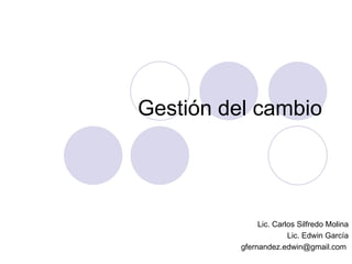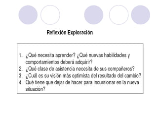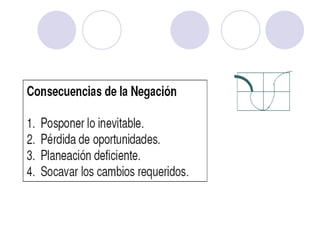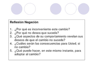 Este documento trata sobre la gestión del cambio en las organizaciones. Explica conceptos clave como el cambio, la intervención para el cambio y los agentes del cambio. También describe la curva del cambio y sus cuatro etapas: negación, resistencia, exploración y compromiso. Finalmente, detalla los comportamientos típicos de cada una de estas etapas por las que suelen pasar las personas durante un proceso de cambio organizacional.