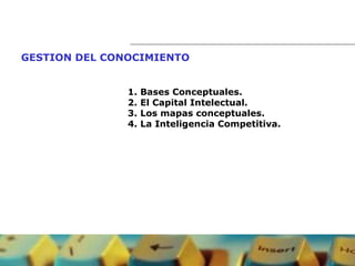 Este documento trata sobre la gestión del conocimiento y sus bases conceptuales. Explica conceptos clave como información, conocimiento, competencia, innovación y ventaja competitiva. También describe los procesos de conversión del conocimiento, los tipos de capital intelectual de una organización, y la importancia de gestionar el conocimiento para mantener la ventaja competitiva en el mercado.