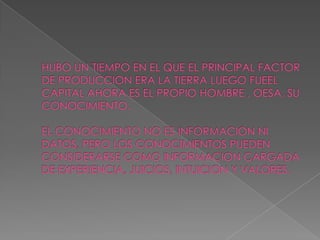 El documento describe los procesos de socialización, internalización, externalización y combinación que conforman la conversión del conocimiento tácito a conocimiento explícito y viceversa según el modelo SECI. También presenta los motivos y beneficios de la gestión del conocimiento en las organizaciones.