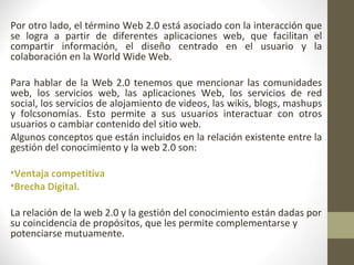 La gestión del conocimiento se ocupa de identificar, capturar y evaluar el conocimiento organizacional para añadir valor a los productos y servicios de una organización. La Web 2.0 facilita la interacción y colaboración entre usuarios a través de comunidades web, redes sociales, wikis y blogs. Existe una relación entre la gestión del conocimiento y la Web 2.0 porque comparten el objetivo de aprovechar el conocimiento de los usuarios y porque las herramientas de la Web 2.0 permiten complementar y potenciar los esfuerzos de gestión del