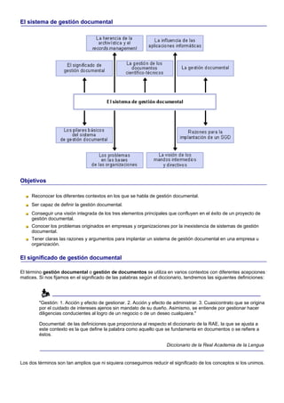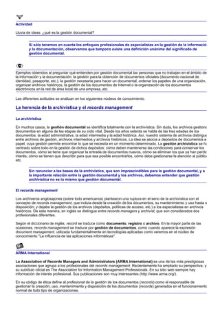 - Algunas definiciones se centran sólo en aspectos parciales como la gestión de documentos científico-técnicos o la gestión de archivos